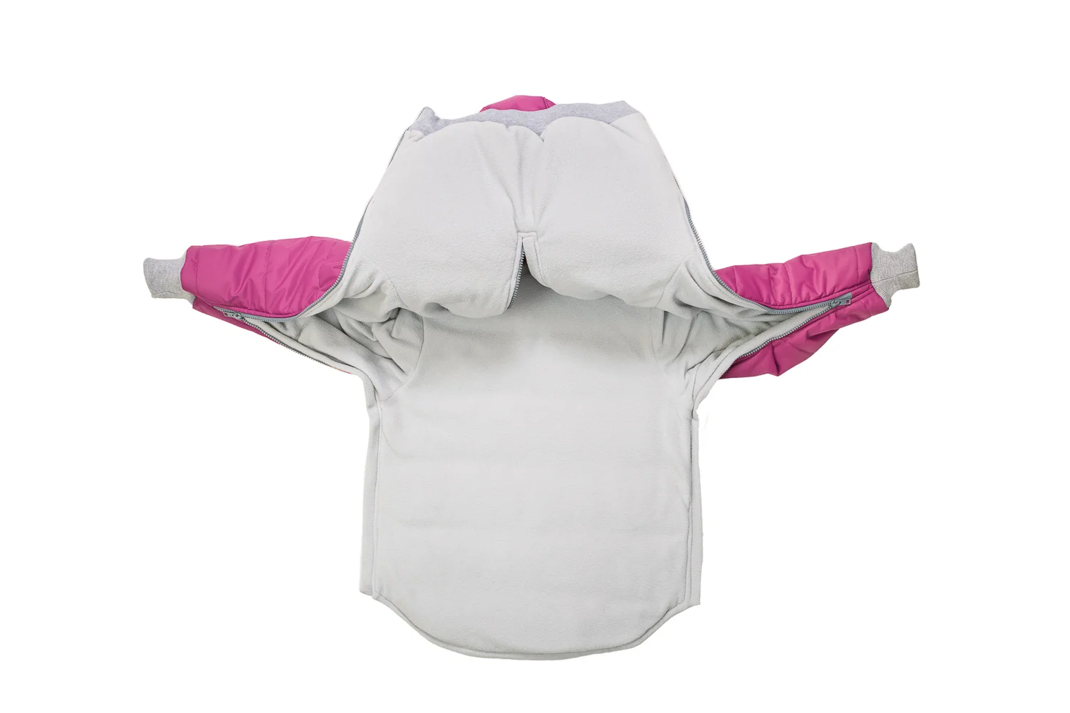 Расположите куртку на горизонтальной поверхности, откиньте верхнюю часть, уложите ребенка в куртку, накройте верхней частью. Проденьте руки ребенка в мягкие манжеты. Застегните молнии от манжета до низа куртки. Застегните молнию на груди."