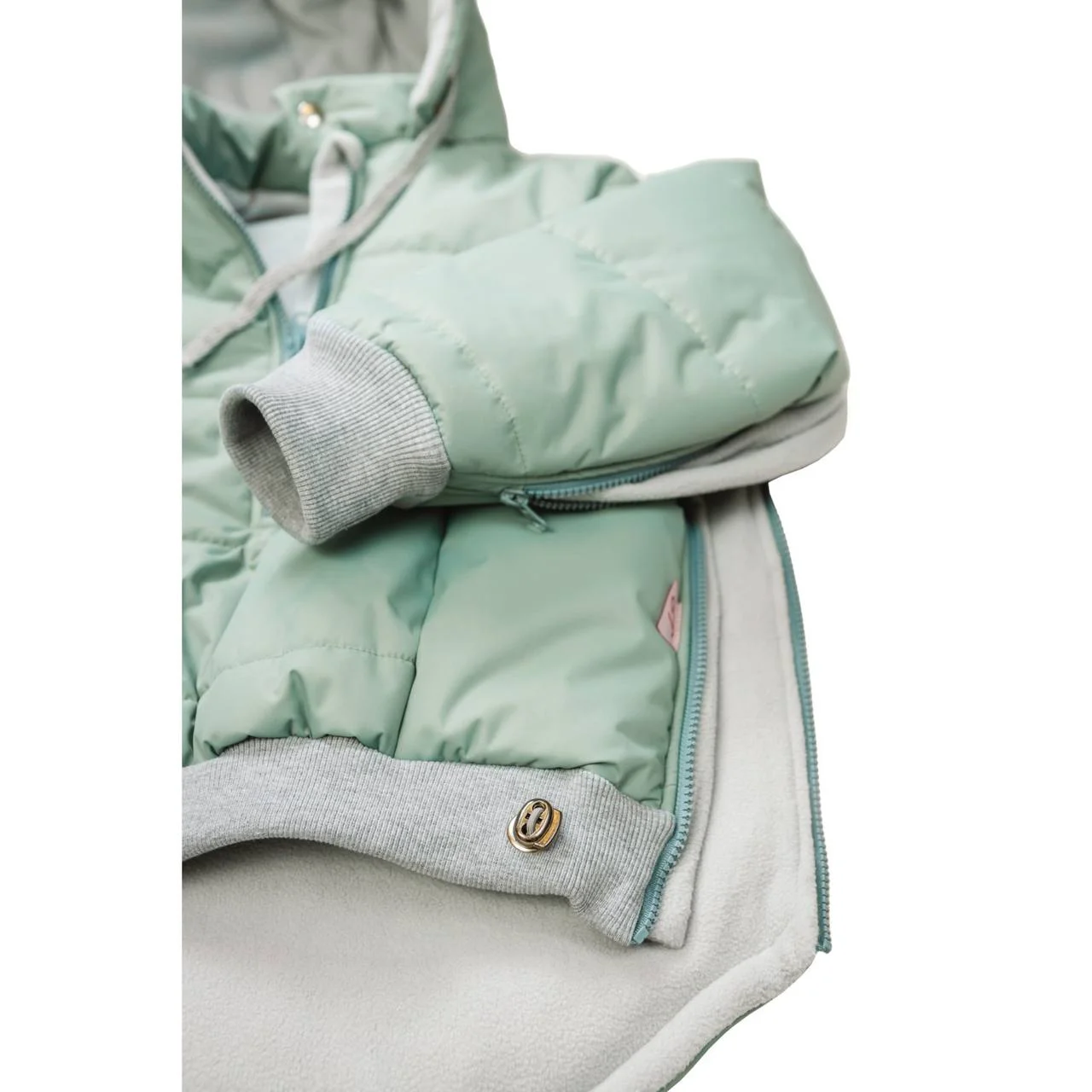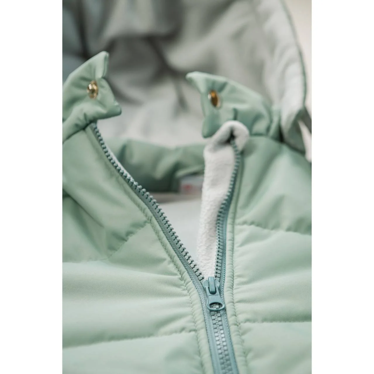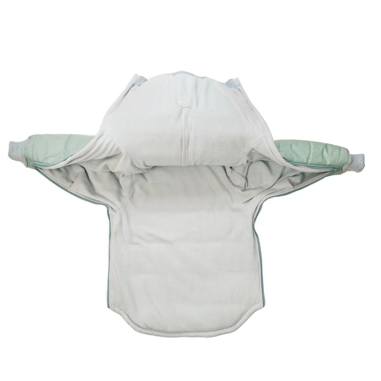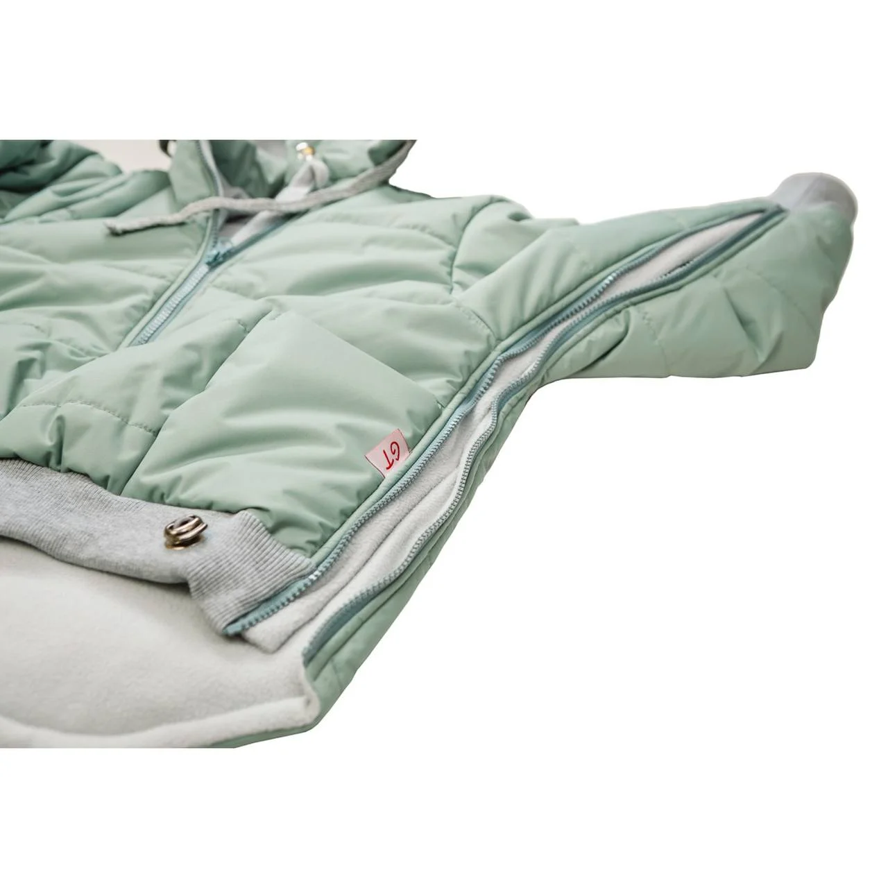 Расположите куртку на горизонтальной поверхности, откиньте верхнюю часть, уложите ребенка в куртку, накройте верхней частью. Проденьте руки ребенка в мягкие манжеты. Застегните молнии от манжета до низа куртки. Застегните молнию на груди."