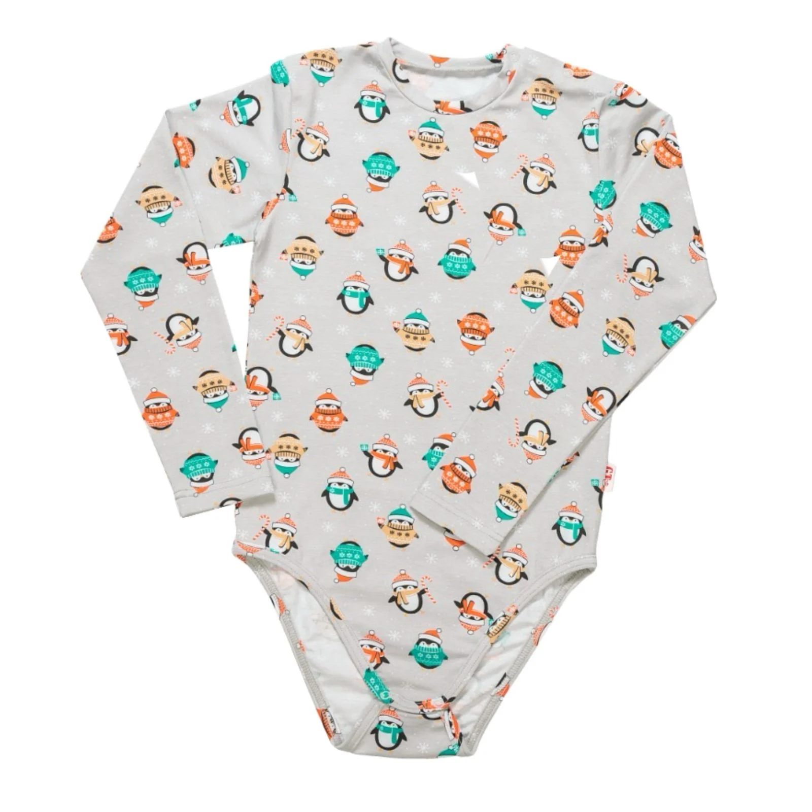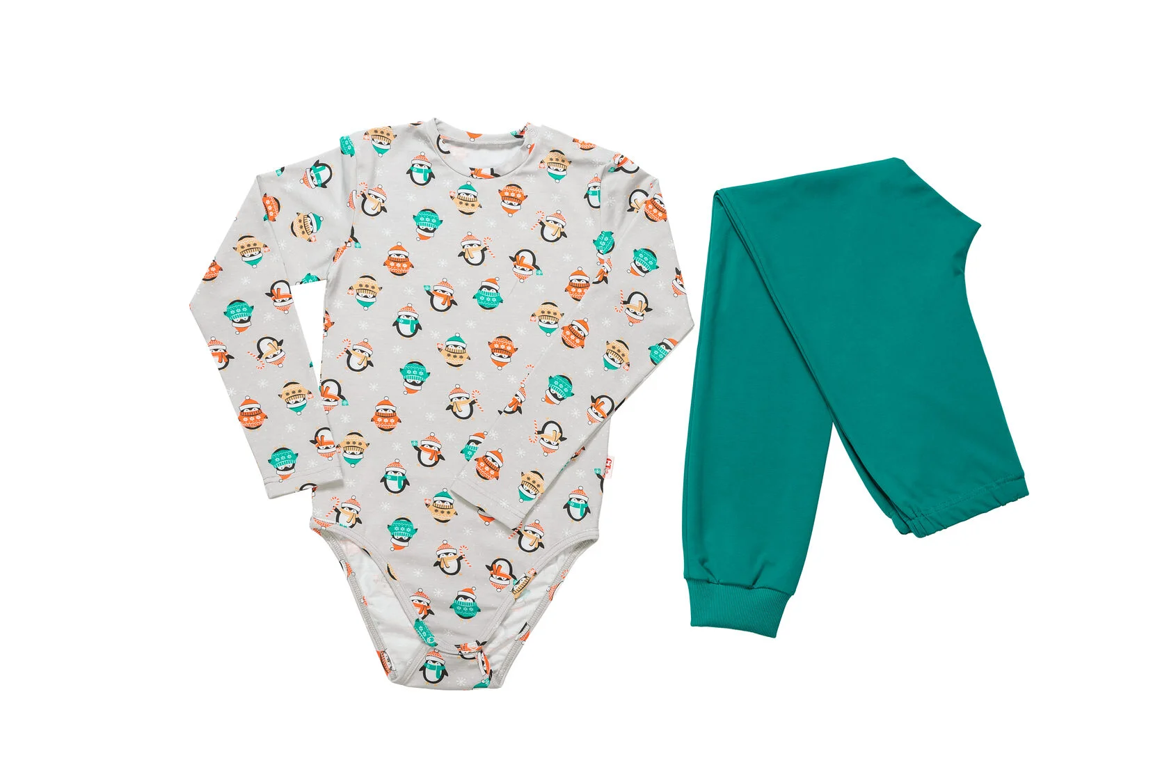 рекомендован для фиксации подгузников — позволяет менять их, не раздевая человека целиком. Боди одевается через голову, есть кнопки на плече и в паховой области. Длинные рукава позволяют не одевать ничего поверх боди, а яркий принт ткани представляет боди как обычную повседневную одежду.