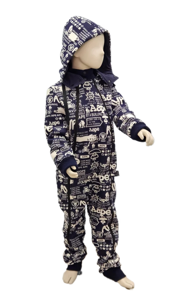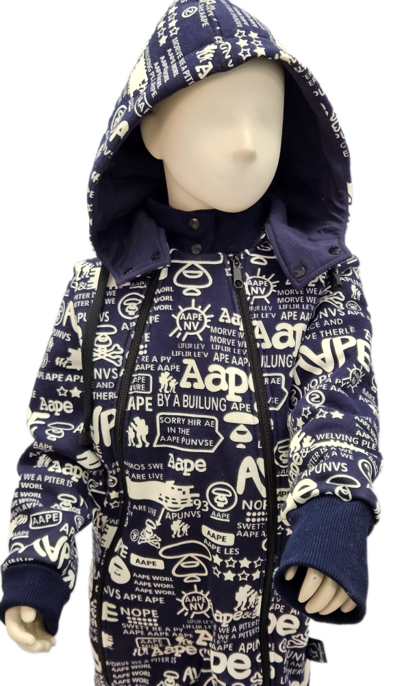 Две молнии по всей длине комбинезона, которые раскрываются для удобного одевания ребенка. Отстегивающийся капюшон на молнии и манишка на кнопках для защиты от ветра и холода. Воротник-стойка на кнопках. Комфорт посадки обеспечен за счет конструктивной резинки на поясе сзади. Растущие манжеты позволяют использовать комбинезон несколько сезонов.