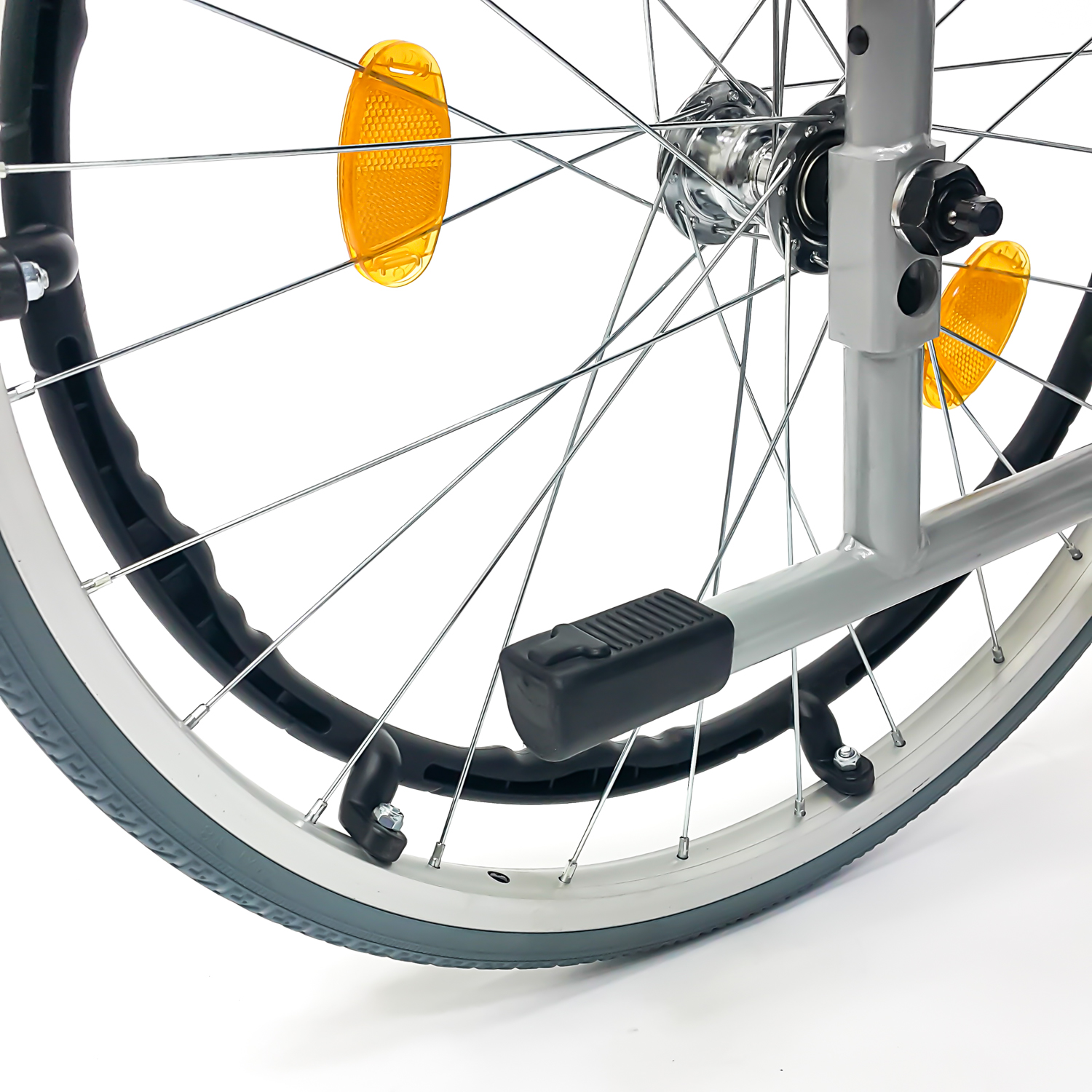 Компактное и недорогое кресло-коляска с ручным приводом подойдет как для дома, так и для прогулок на улице и обеспечит длительное и комфортное пребывание в сидячем положении человека без утомления и развития осложнений. Материал сидения не пропускает влагу, устойчив к ее воздействию и поддается санитарной обработке. Рама коляски изготовлена из стальных труб и имеет двойную крестовину, что увеличивает надежность и долговечность кресла. В качестве наружного покрытия использована порошковая эмаль серого цвета. Тормоза работают по принципу зажатия ведущего колеса. Для облегчения посадки-высадки, а также уменьшения длины коляски при транспортировке подножки откидываются, а также легко снимаются. Их можно отрегулировать по высоте в 4-х положениях. Также предусмотрен матерчатый ремень под икры для поддержки ног. В конструкции кресла-коляски предусмотрены легко откидывающиеся подлокотники. Они легко убираются за спинку коляски. Кресло-коляска комплектуется быстросъемными задними колесами с литыми шинами с размером 600 мм. Передние колеса с литыми шинами диаметром 180 мм. Большое заднее колесо имеет интегрированный обод с удобным захватом для пальцев рук. Конструкция втулки включает в себя два вставную быстросъемную ось для демонтажа колес при транспортировке и замене. Кресло-коляска оснащена ручками для толкания сопровождающим лицом. На спинке коляски имеется удобный закрывающийся карман для мелких вещей. Кресло-коляска имеет два положения заднего колеса, позволяющим регулировать высоту сидения коляски 47 или 50 см. Длина кресла-коляски с подножками в самом нижнем рабочем положении 105 см, без подножек – 81 см. Высота кресла-коляски 91 см. Высота подлокотников 20 см. Глубина сиденья кресла-коляски 41 см (от передней до задней кромки сиденья). Вес кресла-коляски 18 кг. Грузоподъемность кресла-коляски 125 кг. В комплект поставки входит: руководство пользователя (паспорт) на русском языке, гарантийный талон на сервисное обслуживание.