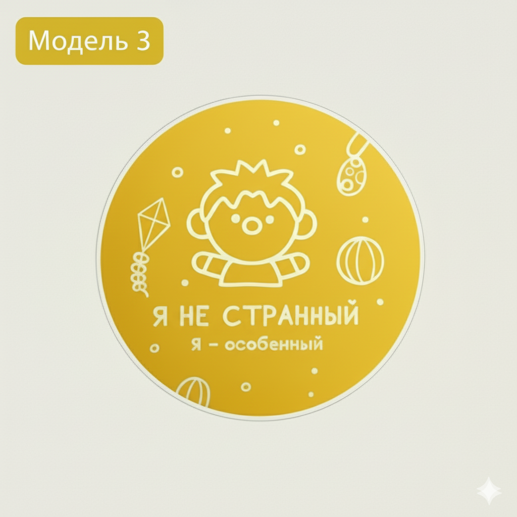 Внимание! При заказе наклеек для создания сигнальных значков убедитесь, что номер модели в карточке товара совпадает с номером модели в разделе с размерами. Это гарантирует получение именно того варианта, который вы выбрали. Сигнальные наклейки-значки: забота и безопасность без лишних затрат! Легко создайте профессиональные сигнальные значки самостоятельно. Просто нанесите самоклеющуюся основу с ярким рисунком на любую заготовку для значка. Наклейка надежно держится на одежде, коляске, рюкзаке. Ключевые преимущества сигнальных наклеек: мгновенное информирование — четко и вежливо сообщают об особенности ребёнка без лишних слов. универсальность — легко клеятся на одежду, коляску, рюкзак, инвалидную коляску и другие поверхности. экономичность — стоимость и пересылка в конверте дешевле готовых значков. простота использования — не требуют специальных инструментов: отделил и наклеил. безопасность — помогают избежать недопонимания и создать комфортную среду для ребёнка. Позаботьтесь о комфорте вашего ребенка легко и быстро!