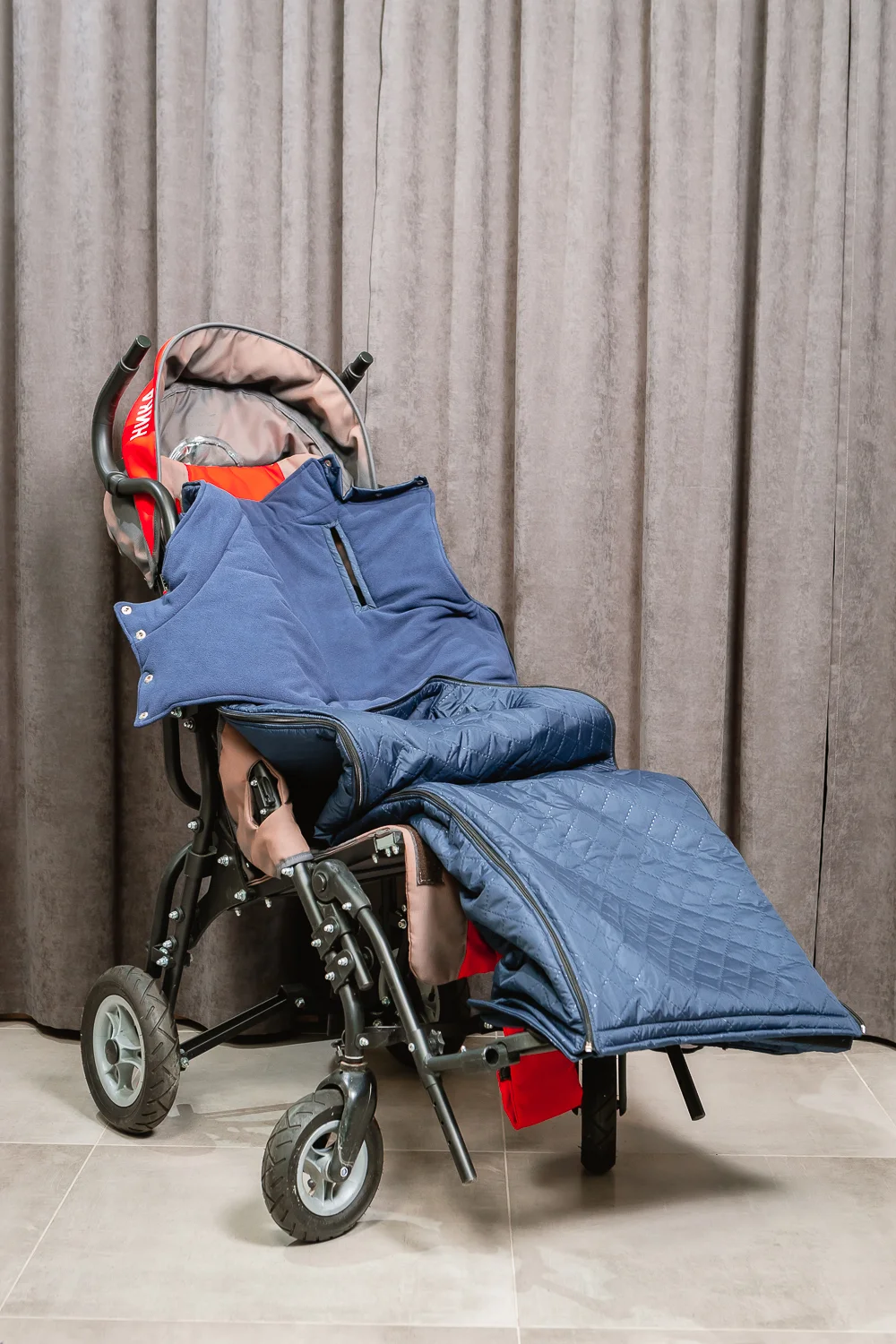 Рады представить вам зимний прогулочный мешок! Мешок универсален и подходит для всех видов инвалидных колясок. На задней спинке полотна - прорези для ремней коляски и для абдуктора. По бокам два распашных замка, которые открываются в обе стороны. Воротник стойка застегивается на кнопки. Низ откидной, его можно убирать назад или закрывать им ноги, по необходимости.