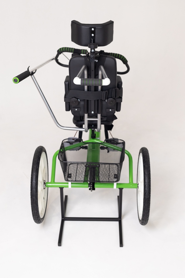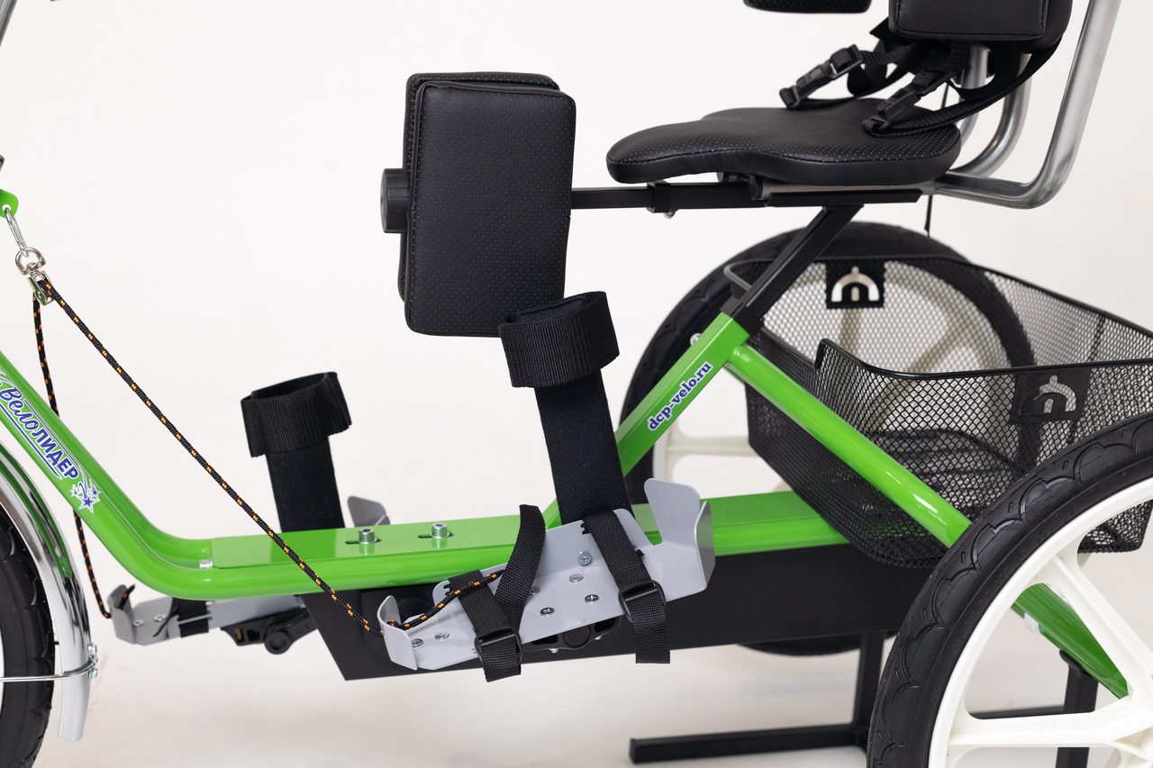 Специализированный трехколесный велосипед имеет ножной привод. Принцип движения колёс: одноосевой. Привод осуществляется на одно заднее колесо. Задние колёса установлены широко для устойчивости и безопасности. Цепь надёжно закрыта кожухом во избежание травматизации. Рама включает в себя площадки под стопу с задними и передними съёмными тросиками -стабилизаторами для удержания педалей в правильном положении во всех фазах движения. Крепления стоп имеют текстильные ремешки, фиксирующие стопу во всех плоскостях. Передаточное число низшей передачи обеспечивает лёгкое вращение педалей для начинающих и позволяет ездить только на безопасной скорости. Задняя ось встроена в раму, что определяет меньшее сопротивление при занятиях на подставке дома. Велосипед имеет регулируемые по высоте: спинку, сидение, руль с амплетудой вылета до 15 см. Руль может закрепляться под нужным углом. Вынос руля позволяет регулировать расстояние вытянутой руки, а широкое специализированное сидение более адаптировано под велотренажер. Конструкция рамы имеет более удобную, низкую и комфортную посадку. Стояночный тормоз фиксирует оба задних колеса. Сборка осуществляется с помощью инструментов, которые входят в комплект. Для достижения более удобной и быстрой транспортировки модель имеет съемные задние задние и передние колеса. С велосипедом поставляются руководство пользователя и гарантийный талон. Трехколесный велосипед можно использовать как стационарный тренажер для ног в домашних условиях, так и на улице. Велосипед-тренажер для детей больных ДЦП изготавливается по индивидуальному заказу, конкретно под точный рост ребёнка и длину ноги ребенка от паха до пятки. Это делается для того чтобы он прослужил Вам как можно дольше.